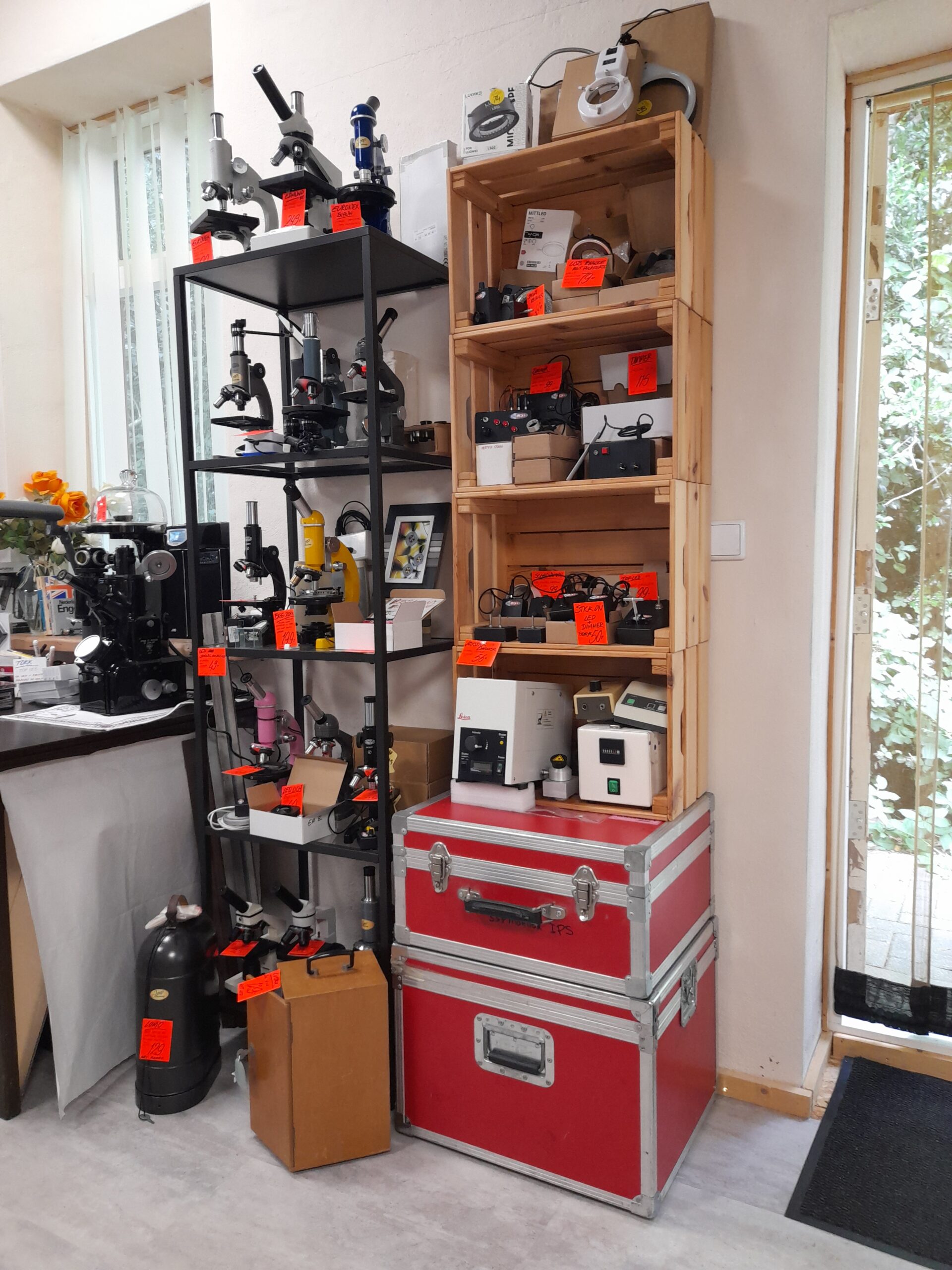Winkel, in onze winkel staan veel geheel gereviseerde, en nieuwe microscopen, demonstreren we graag onze camera’s en hebben we een ruime voorraad optische en mechanische onderdelen.